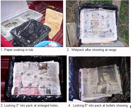 First picture shown is a typical wetpack that I use. Note picture 4. with bullets showing 8" deep into the wetpack, CorBon 90gr, Rem GS 102gr, and Speer GD 90gr. Holes remaining are for bullets that went deeper. See the WetPack picture for details. Not being tested is Win SilverTip which is unsatisfactory, poor penetration. This was shown in the previous .380acp wetpack test.