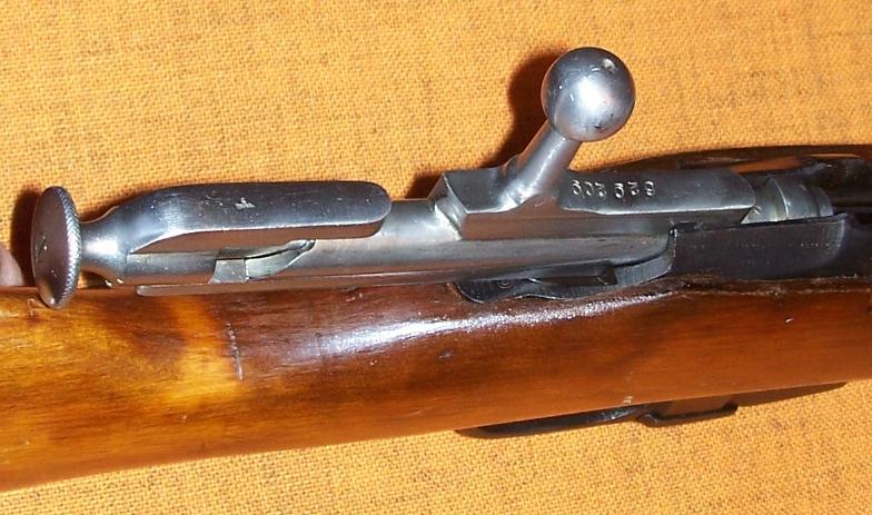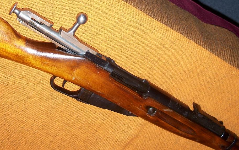 Here are two photos of the distinctive Mosin bolt and receiver. Mosins are extremely simple and sturdy rifles, just right for Russian peasant soldiers of the early 20th century. The round knob at the back of the bolt serves as a safety. You pull it straight back, and turn it counter clockwise, to prevent the rifle from firing.