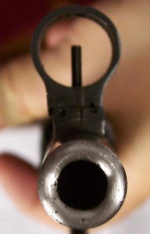 Here's a photo of the front sight from the "business end" of the barrel. The barrel of my Mosin has not been "counter-bored." The rifling is dark, however it looks very clean and strong, no rust or pitting at all. I wonder if it has even been fired, it looks so good. (I've shot about 20/30 round through it myself, and it is quite accurate.)