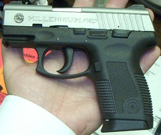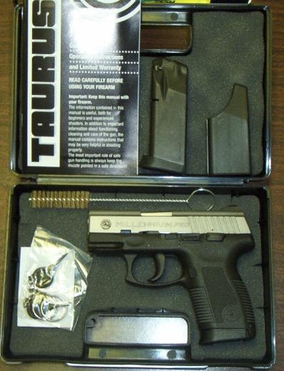The Millennium Pro PT145 is almost small enough to be a pocketgun, however it shoots the powerful .45 cartridge. It makes no sense to call it a "mousegun," however compact it may be; therefore I classify it as a "ratgun." Here it is in it's box. I paid $349.00 for this gun, which came with a stainless steel slide, frame rail, two magazines, a magloading device and a plastic brush.