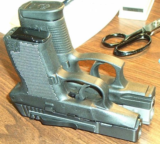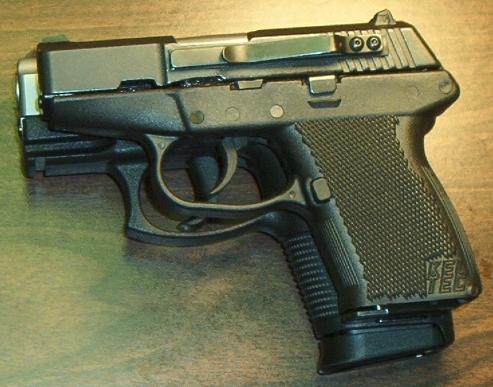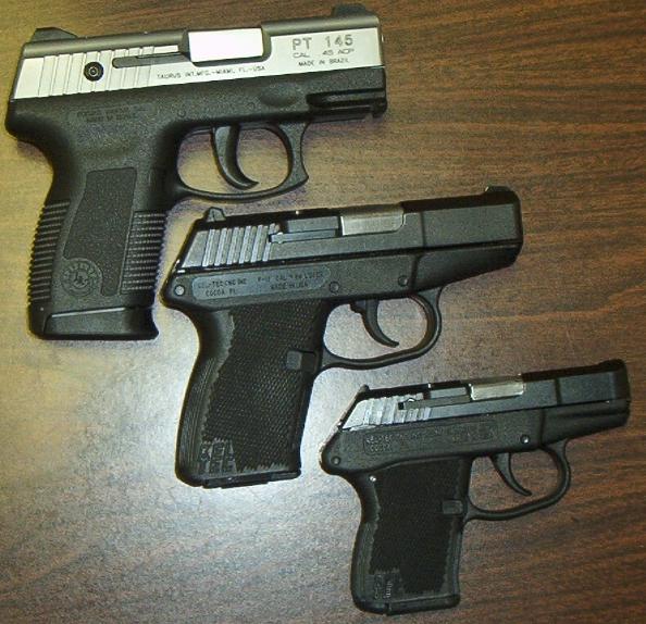 And a final side-by-side view of the Taurus PT145 and the Kel-Tec P11. The trigger pull weight of the PT145 is smoother, lighter and shorter than that of the Kel-Tec P11, and it is therefore easier to shoot straight. I don't have a scale, but I'm guessing the trigger pull on my PT145 is around 6-8 pounds.