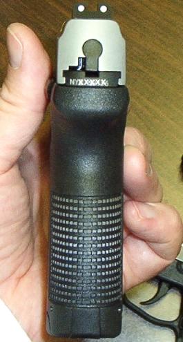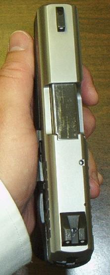 As I stated above, like the Kel-Tec P11, the Taurus PT145 has a metal frame inserted into the polymer frame. The stainless steel slide rides in these grooves in the metal subframe. You will also note the little hole and "spring wire" that holds in the assembly pin, just like in the Kel-Tec.