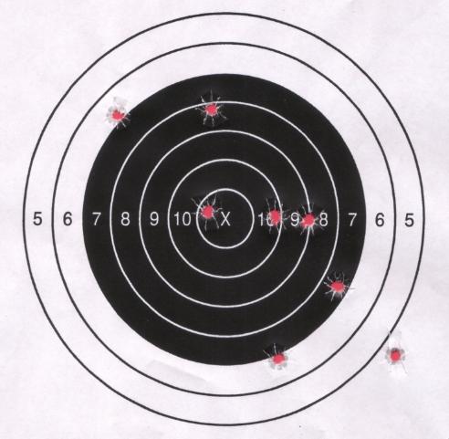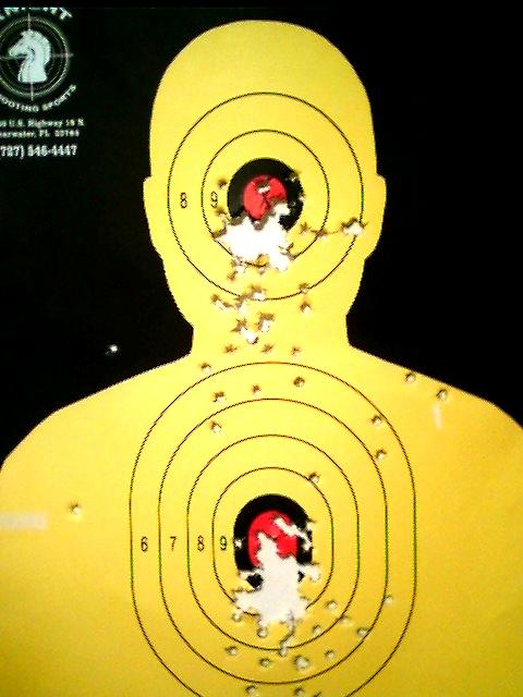 "...this yellow silouette target is 140 shots. 25 at 15 feet and 115 at 21 feet. quite a few rapid fire clips. the red bullseye area on the head is 1 3/16 of an inch wide and the center mass red bullseye area is 1 1/2 inches wide. the rear sight needs to be adjusted as you can tell the groups are low."