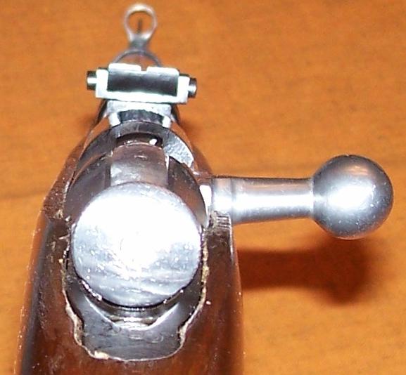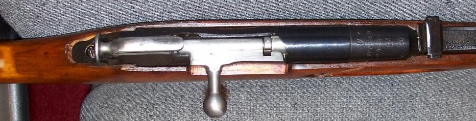 Here are two photos of the distinctive Mosin bolt and receiver. Mosins are extremely simple and sturdy rifles, just right for Russian peasant soldiers of the early 20th century. The round knob at the back of the bolt serves as a safety. You pull it straight back, and turn it counter clockwise, to prevent the rifle from firing.