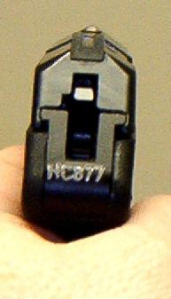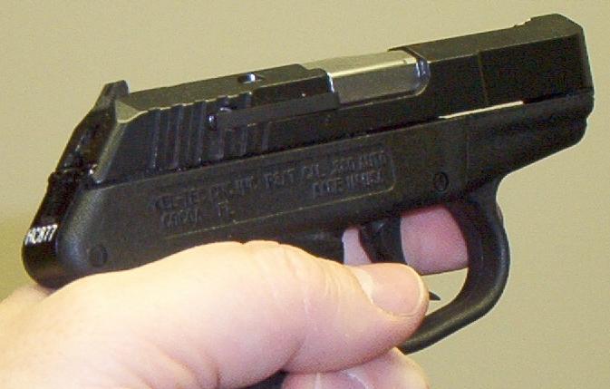 Yesterday I installed the P-Sight on my P-3AT, and sat it aside for the glue to harden. PSEnhancements recommends a 5-day drying period. I intend to wait 5 days before shooting with the P-Sight. However, I just couldn't stand to be without my P-3AT in my pocket, so this morning I put the pistol back together again, and took some pictures. In this side view you can see that the P-Sight doesn't stand up very tall. I carry my P-3AT in the zippered case that Kel-Tec supplies, and there are no snags putting the weapon in and out of the case while it is in my pocket.