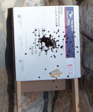 I shot six full magazines, and had one in the chamber the first time around, for a total of 37 rounds. I shot my P3AT at a range of 5 yards from my homemade targets and "target holder." Here's the target holder at the end of my shooting day: