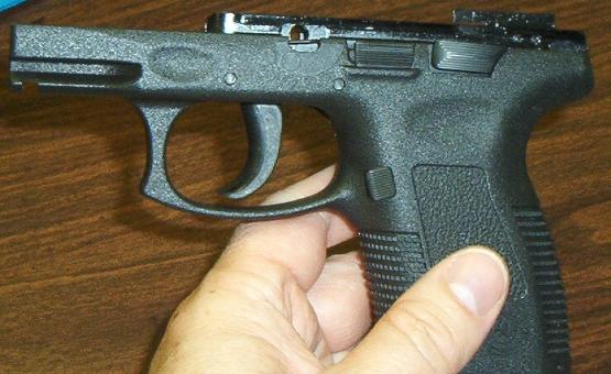 As I stated above, like the Kel-Tec P11, the Taurus PT145 has a metal frame inserted into the polymer frame. The stainless steel slide rides in these grooves in the metal subframe. You will also note the little hole and "spring wire" that holds in the assembly pin, just like in the Kel-Tec.